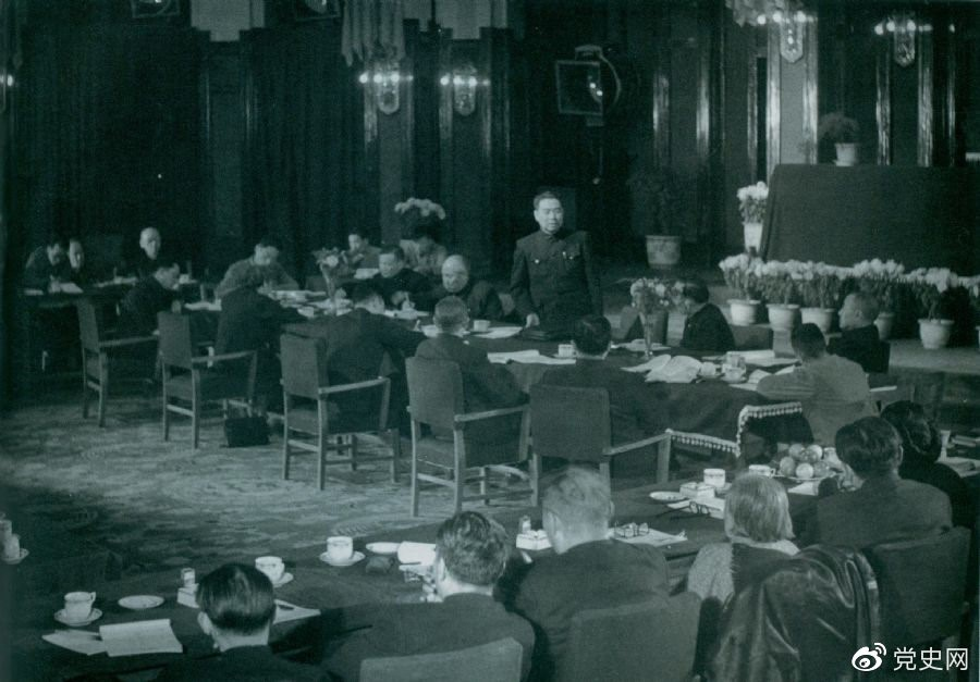 1949年10月21日,周恩來(lái)主持召開(kāi)中央人民政府政務(wù)院第一次會(huì)議。正面左起:陳云、董必武、周恩來(lái)、郭沫若、黃炎培。