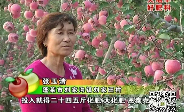 蓬萊市新港街道劉家旺村果農(nóng)張玉清,人稱“蘋果媽媽”。她種植富士,14年生,畝株數(shù)36株,株套袋數(shù)都在1000袋以上,畝產(chǎn)萬斤以上,連續(xù)7年使用眾德進口肥套餐方案,連年豐產(chǎn)豐收,畝效益在3萬元以上。